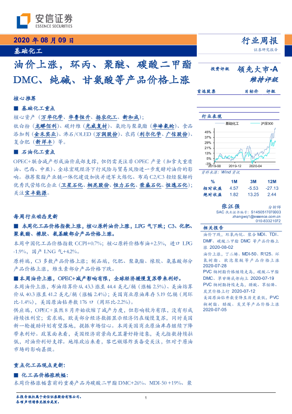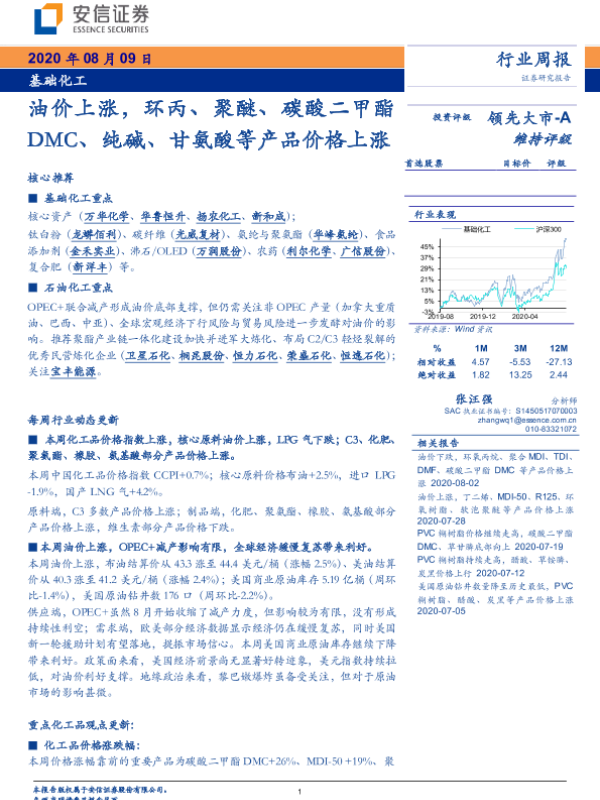 【安信证券】【20200809】基础化工行业周报:油价上涨,环丙、聚醚、碳酸二甲酯 DMC、纯碱、甘氨酸等产品价格上涨-4页