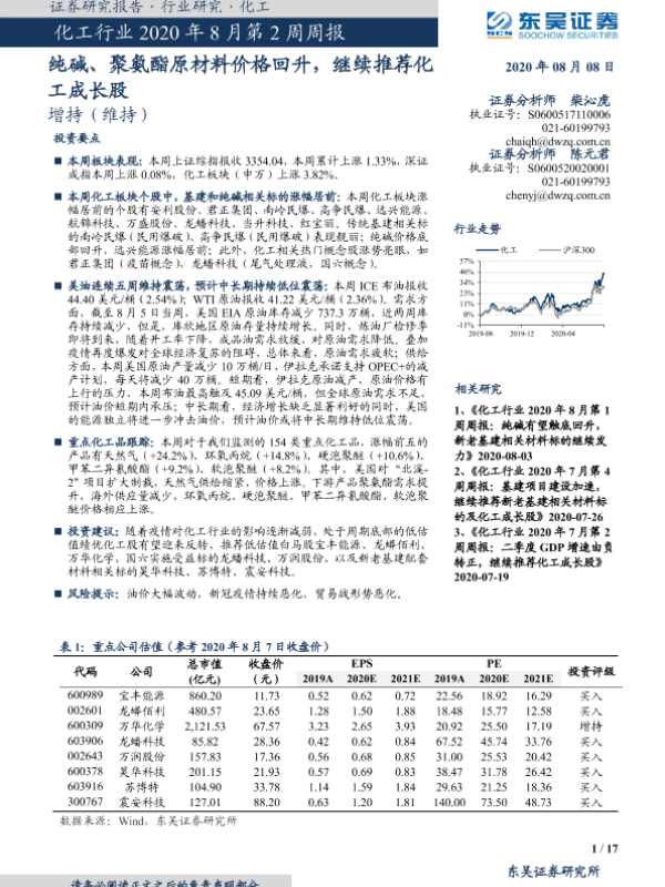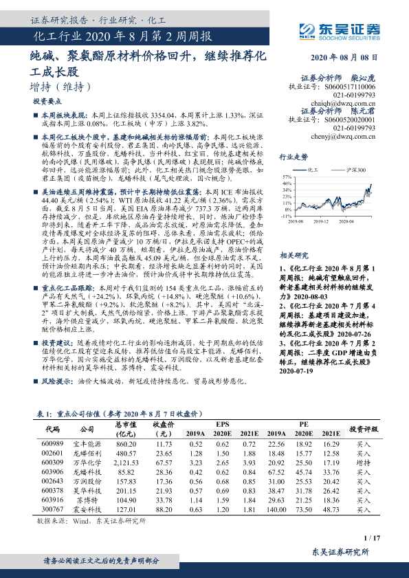 【东吴证券】【20200808】化工行业2020年8月第2周周报:纯碱、聚氨酯原材料价格回升,继续推荐化工成长股-17页