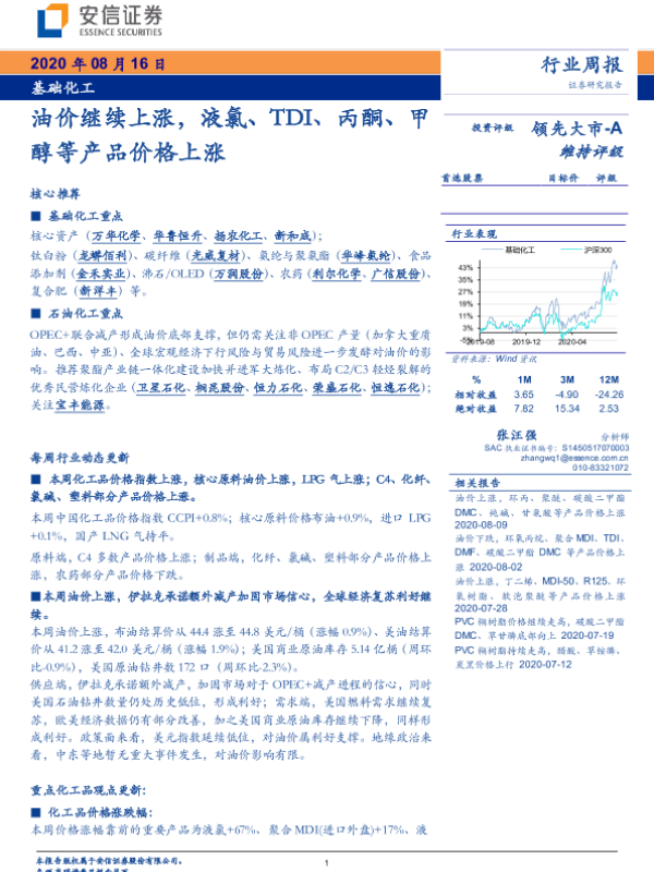 【安信证券】【20200816】基础化工行业周报:油价继续上涨,液氯、TDI、丙酮、甲醇等产品价格上涨-4页