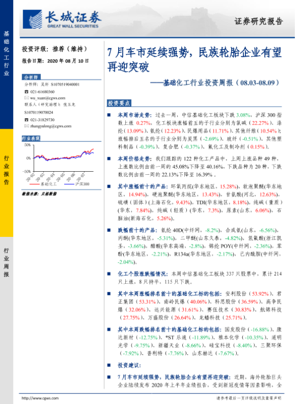 【长城证券】【20200810】20200810-长城证券-基础化工行业投资周报:7月车市延续强势,民族轮胎企业有望再迎突破-26页