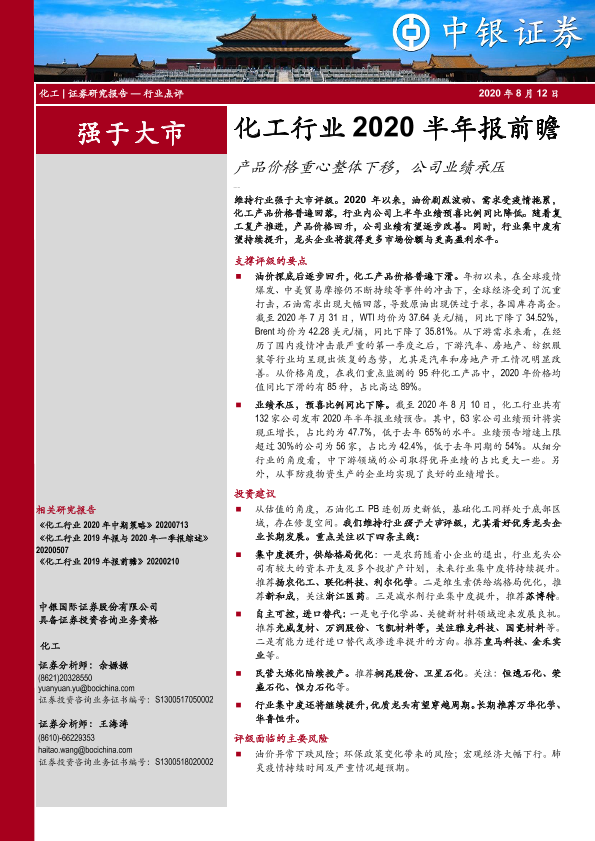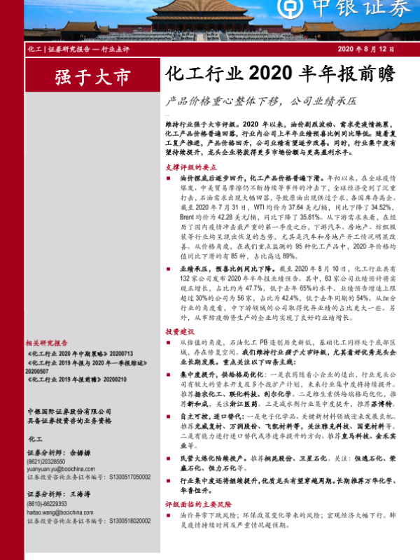 【中银证券】【20200812】化工行业2020半年报前瞻:产品价格重心整体下移,公司业绩承压-12页