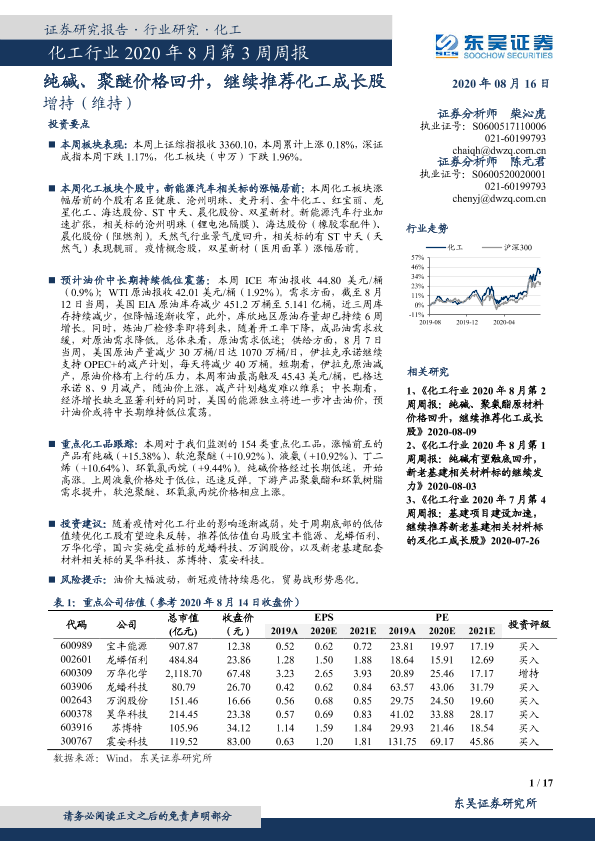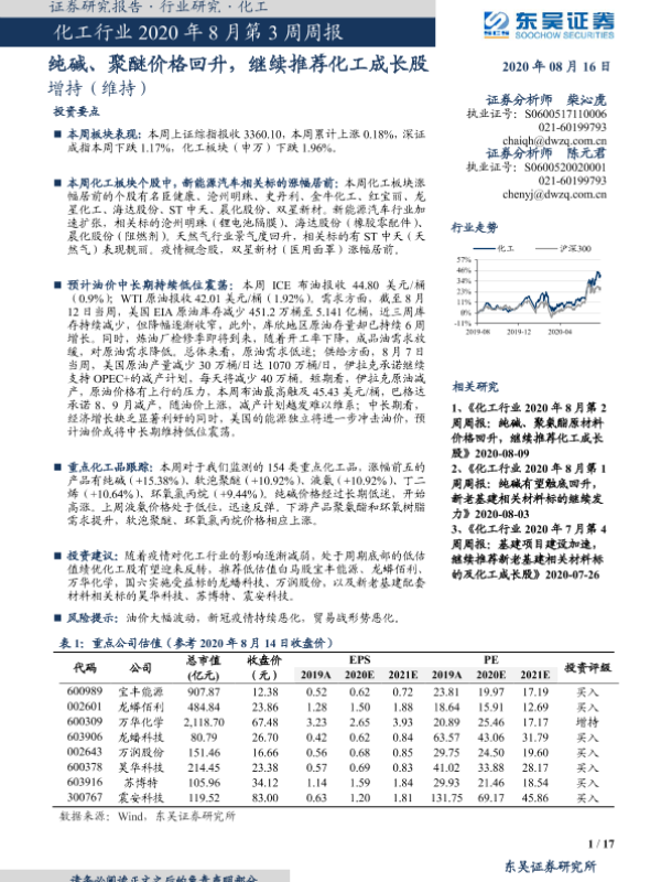 【东吴证券】【20200816】化工行业2020年8月第3周周报:纯碱、聚醚价格回升,继续推荐化工成长股-17页