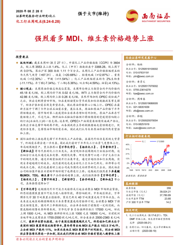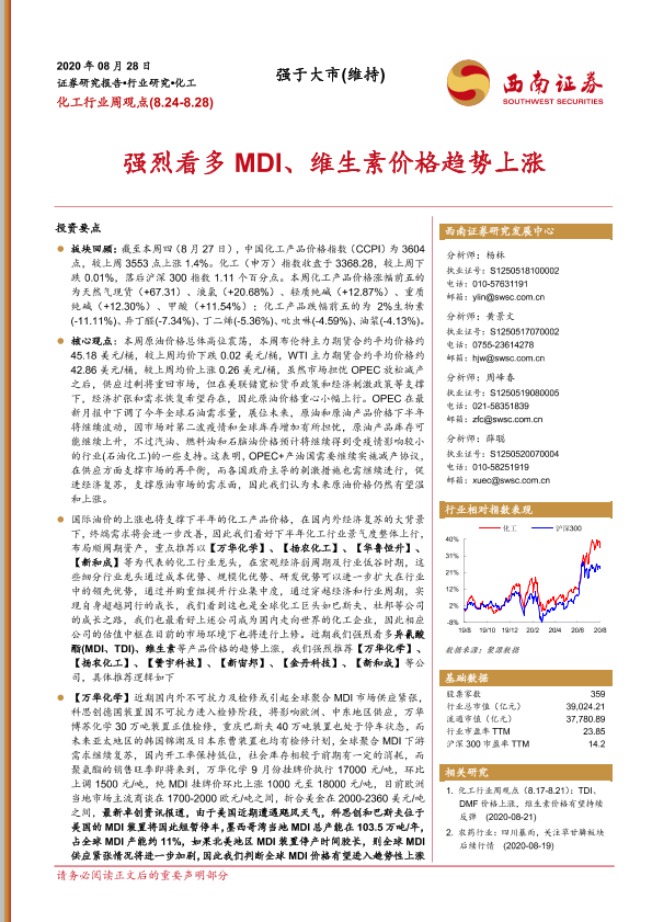 【西南证券】【20200828】20200828-西南证券-化工行业周观点:强烈看多MDI、维生素价格趋势上涨-12页