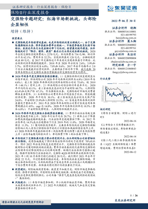 【东吴证券】【20220630】保险Ⅱ行业深度报告:交强险专题研究,红海市场新挑战,头部险企显韧性-26页