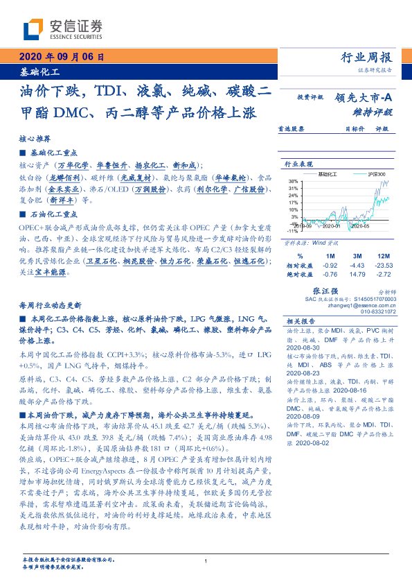 【安信证券】【20200906】基础化工行业周报:油价下跌,TDI、液氯、纯碱、碳酸二甲酯DMC、丙二醇等产品价格上涨-4页