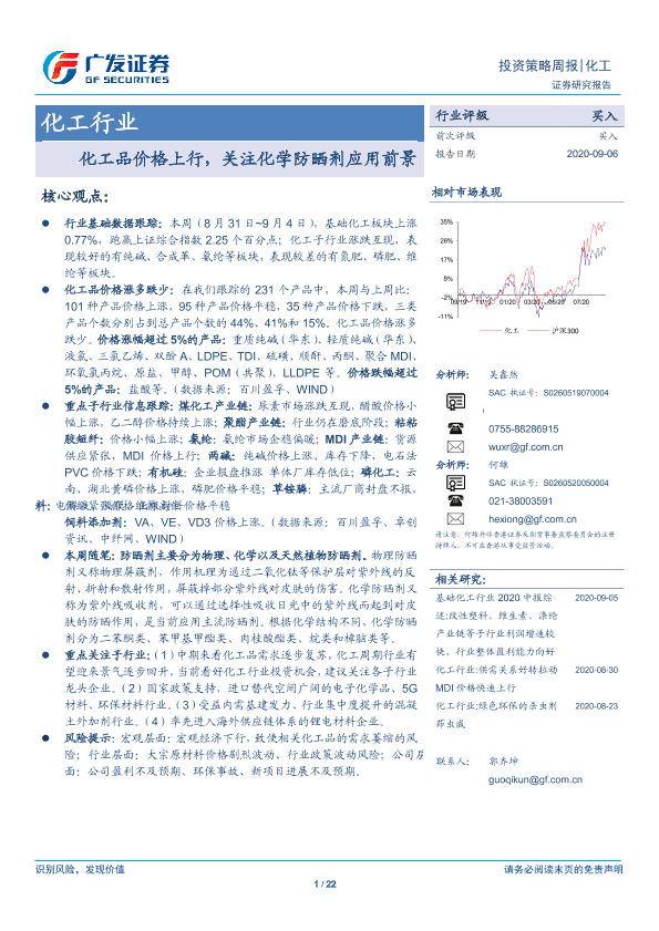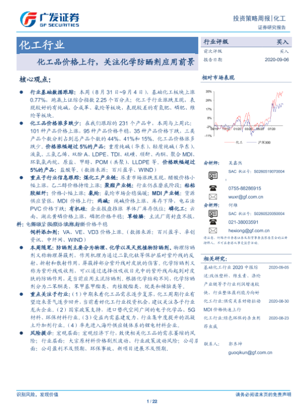 【广发证券】【20200906】20200906-广发证券-化工行业投资策略周报:化工品价格上行,关注化学防晒剂应用前景-22页