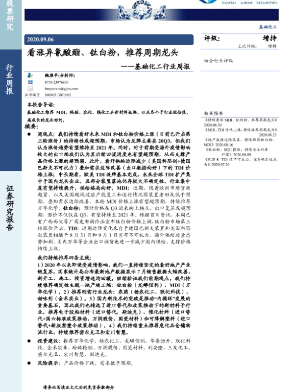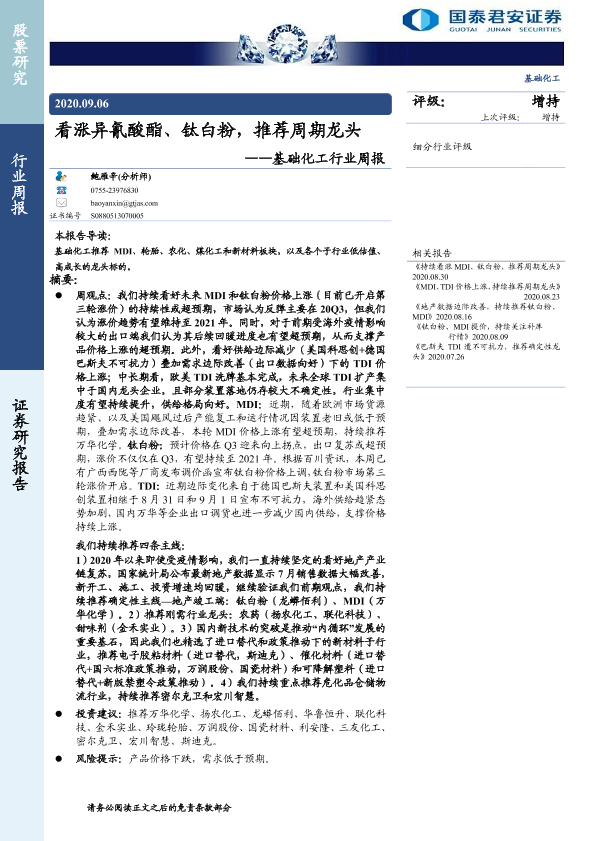 【国泰君安证券】【20200906】20200906-国泰君安-基础化工行业周报:看涨异氰酸酯、钛白粉,推荐周期龙头-19页