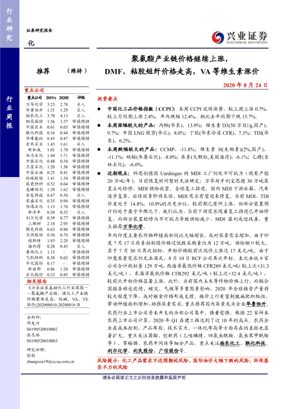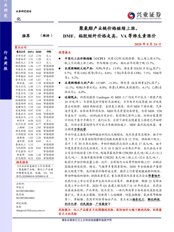 【兴业证券】【20200824】聚氨酯产业链价格继续上涨,DMF、粘胶短纤价格走高,VA等维生素涨价-37页