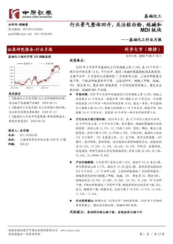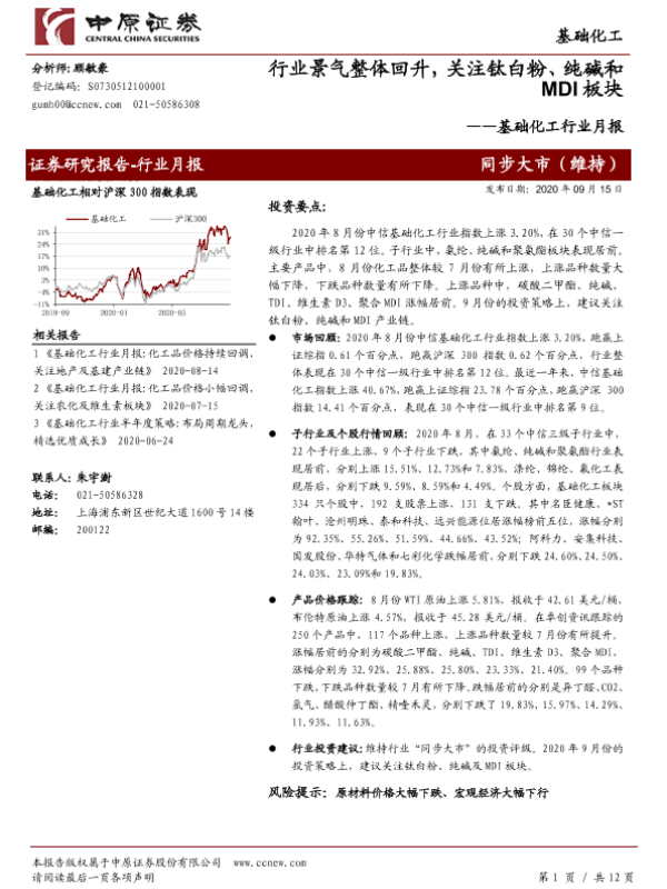 【中原证券】【20200915】基础化工行业月报:行业景气整体回升,关注钛白粉、纯碱和MDI板块-12页