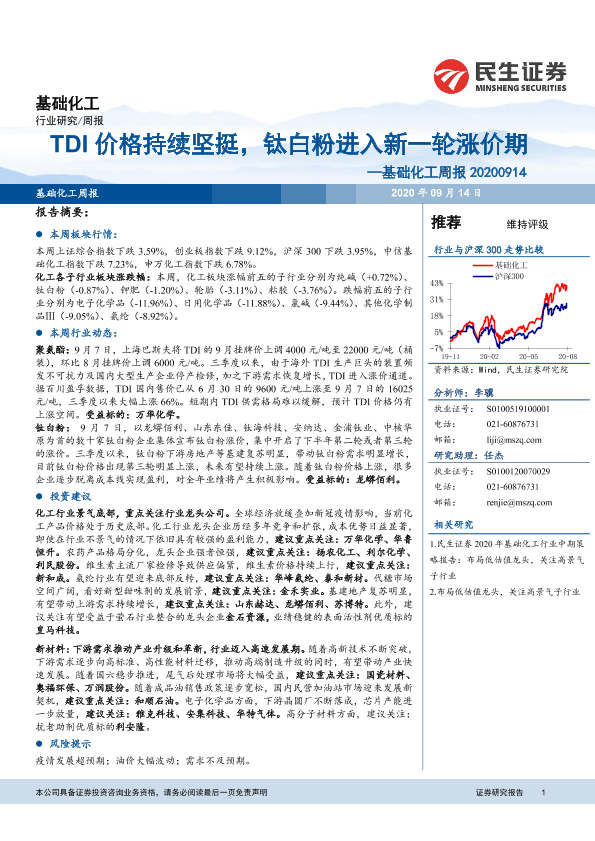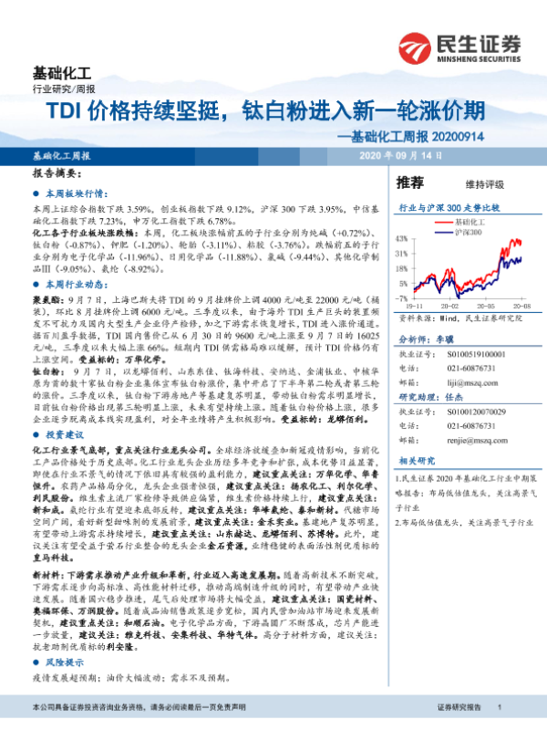 【民生证券】【20200914】基础化工周报:TDI价格持续坚挺,钛白粉进入新一轮涨价期-17页