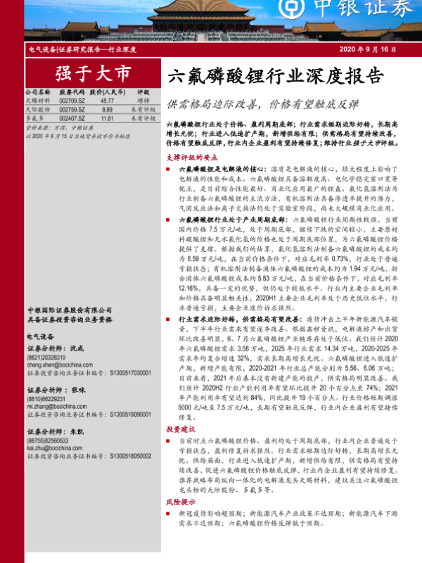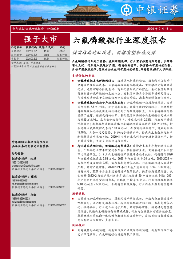 【中银证券】【20200916】六氟磷酸锂行业深度报告:供需格局边际改善,价格有望触底反弹-20页