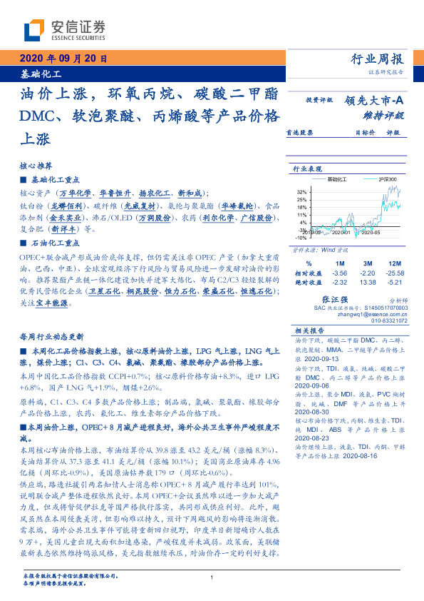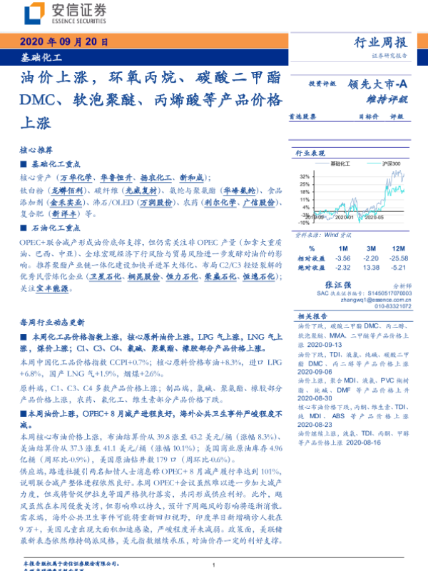 【安信证券】【20200920】基础化工行业周报:油价上涨,环氧丙烷、碳酸二甲酯DMC、软泡聚醚、丙烯酸等产品价格上涨-4页