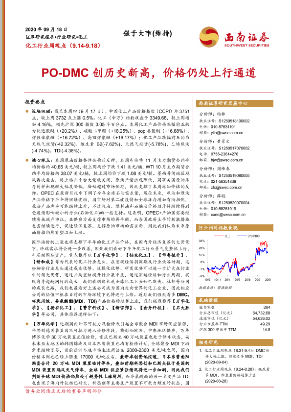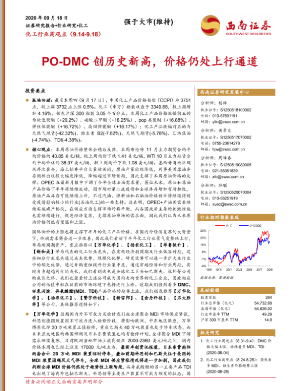 【西南证券】【20200918】20200918-西南证券-化工行业周观点:PO-DMC创历史新高,价格仍处上行通道-11页