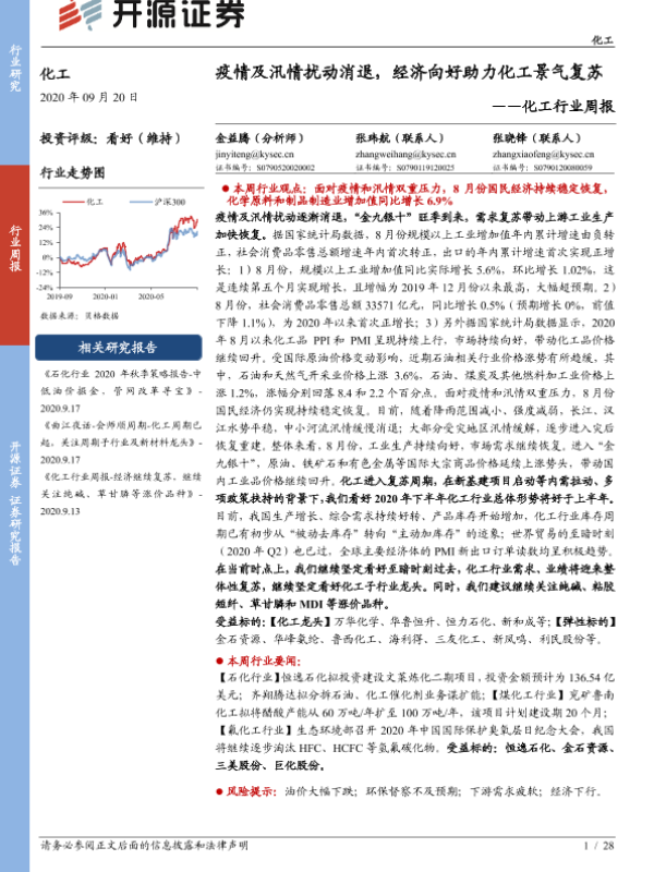 【开源证券】【20200920】化工行业周报:疫情及汛情扰动消退,经济向好助力化工景气复苏-28页