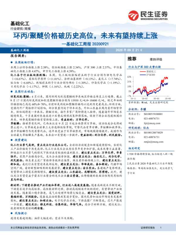 【民生证券】【20200921】基础化工周报:环丙/聚醚价格破历史高位,未来有望持续上涨-17页