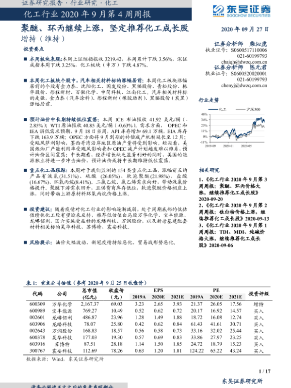 【东吴证券】【20200927】化工行业2020年9月第4周周报:聚醚、环丙继续上涨,坚定推荐化工成长股-17页