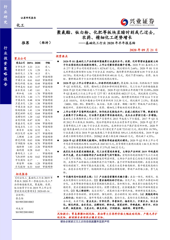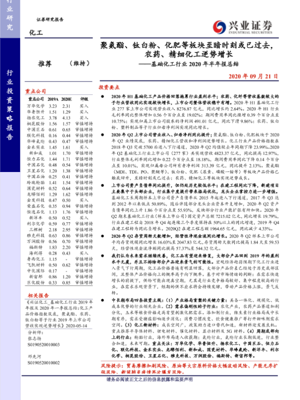 【兴业证券】【20200921】基础化工行业2020年半年报总结:聚氨酯、钛白粉、化肥等板块至暗时刻或已过去,农药、精细化工逆势增长-44页