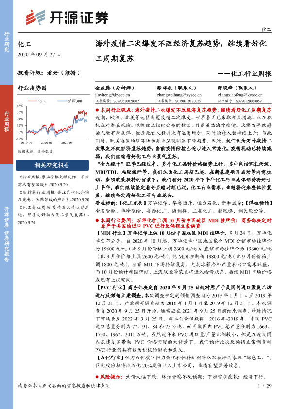 【开源证券】【20200927】化工行业周报:海外疫情二次爆发不改经济复苏趋势,继续看好化工周期复苏-29页