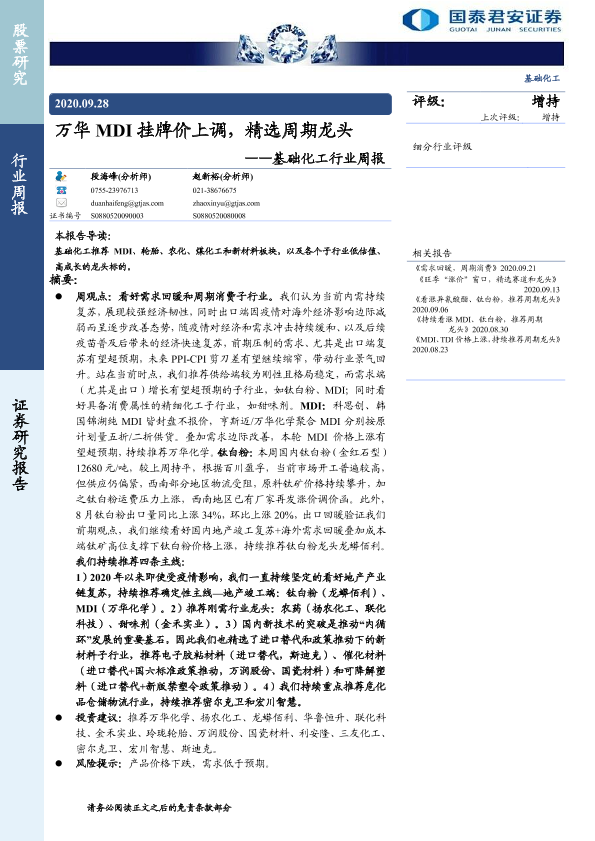 【国泰君安证券】【20200928】基础化工行业周报:万华MDI挂牌价上调,精选周期龙头-20页