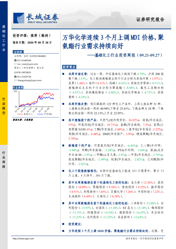 【长城证券】【20200928】20200928-长城证券-基础化工行业投资周报:万华化学连续3个月上调MDI价格,聚氨酯行业需求持续向好-26页