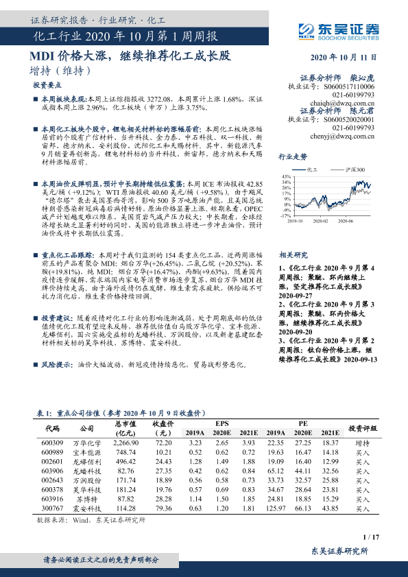 【东吴证券】【20201011】化工行业2020年10月第1周周报:MDI价格大涨,继续推荐化工成长股-17页