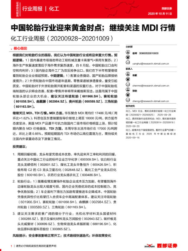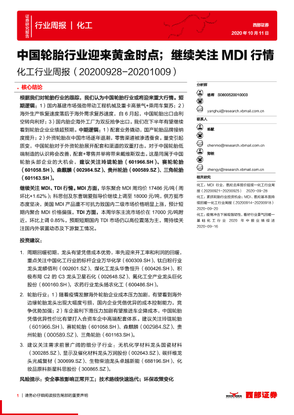 【西部证券】【20201011】20201011-西部证券-化工行业周报:中国轮胎行业迎来黄金时点;继续关注MDI行情-19页