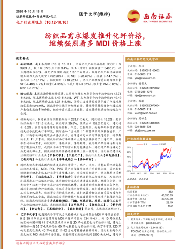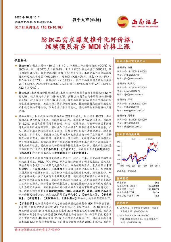 【西南证券】【20201016】20201016-西南证券-化工行业周观点:纺织品需求爆发推升化纤价格,继续强烈看多MDI价格上涨-11页