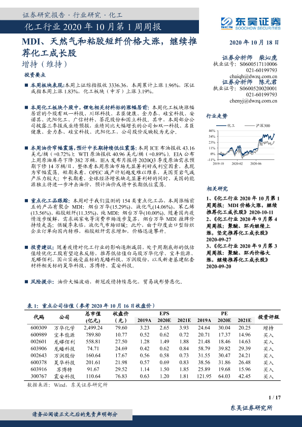 【东吴证券】【20201018】化工行业2020年10月第1周周报:MDI、天然气和粘胶短纤价格大涨,继续推荐化工成长股-17页