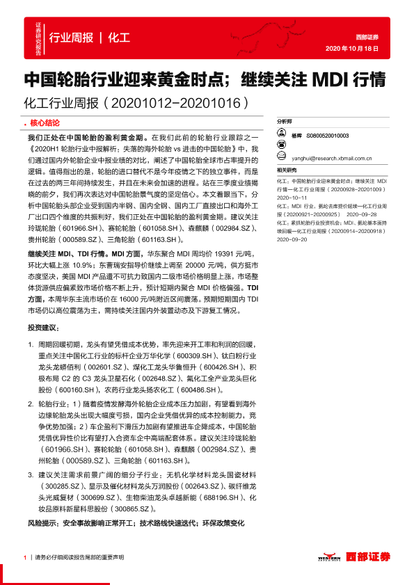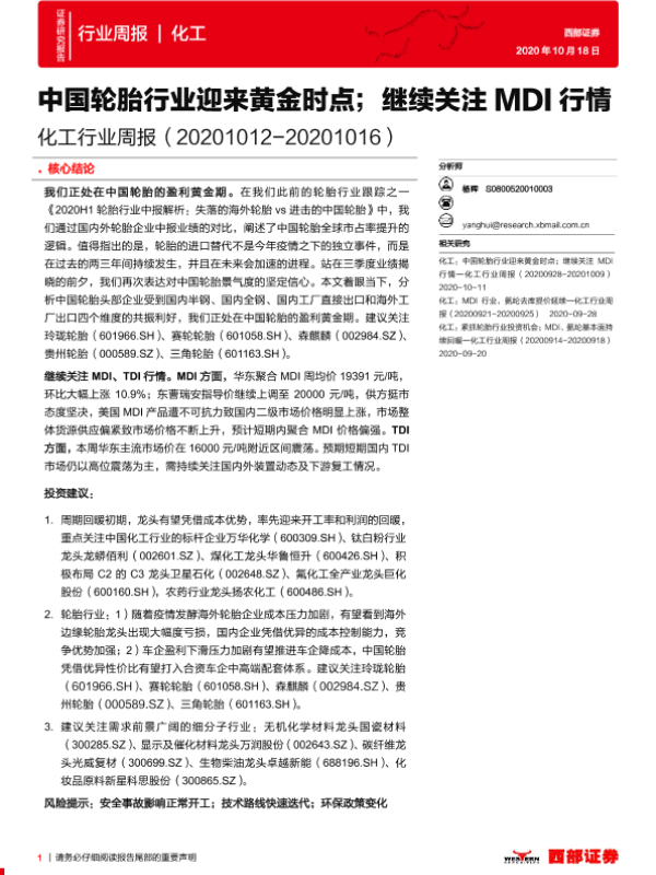 【西部证券】【20201018】20201018-西部证券-化工行业周报:中国轮胎行业迎来黄金时点;继续关注MDI行情-19页
