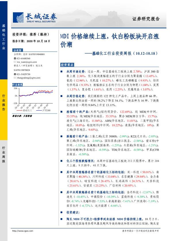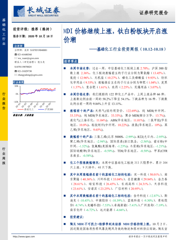 【长城证券】【20201018】20201018-长城证券-基础化工行业投资周报:MDI价格继续上涨,钛白粉板块开启涨价潮-26页