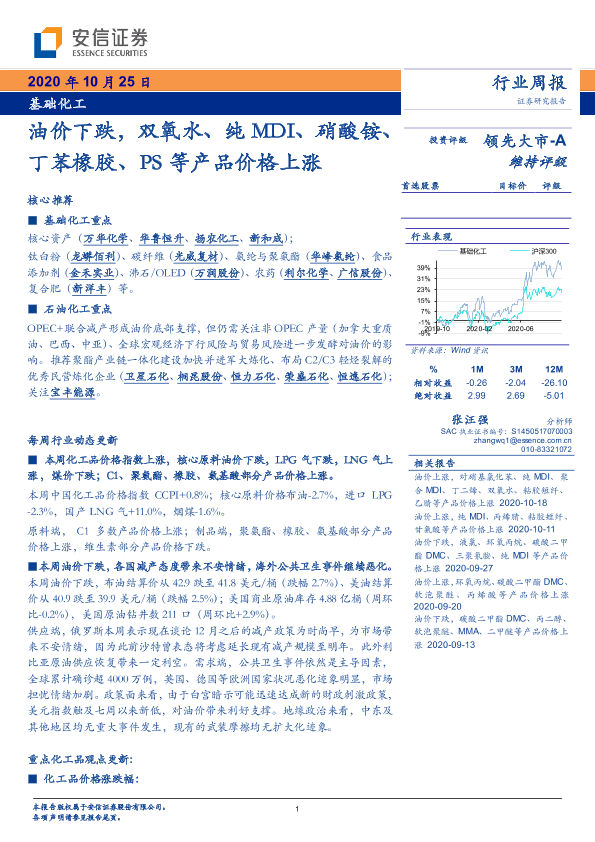 【安信证券】【20201025】基础化工行业周报:油价下跌,双氧水、纯MDI、硝酸铵、丁苯橡胶、PS等产品价格上涨-4页