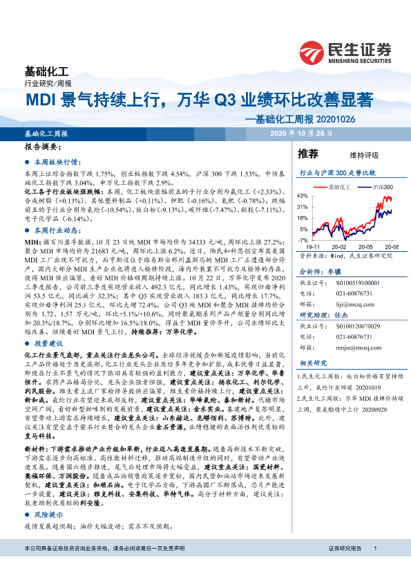 【民生证券】【20201026】基础化工周报:MDI景气持续上行,万华Q3业绩环比改善显著-18页