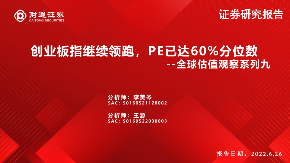 【财通证券】【20220626】全球估值观察系列九:创业板指继续领跑,PE已达60%分位数-28页