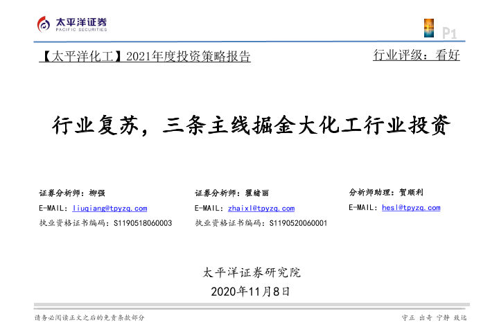 【太平洋证券】【20201108】2021年度投资策略报告:行业复苏,三条主线掘金大化工行业投资-45页