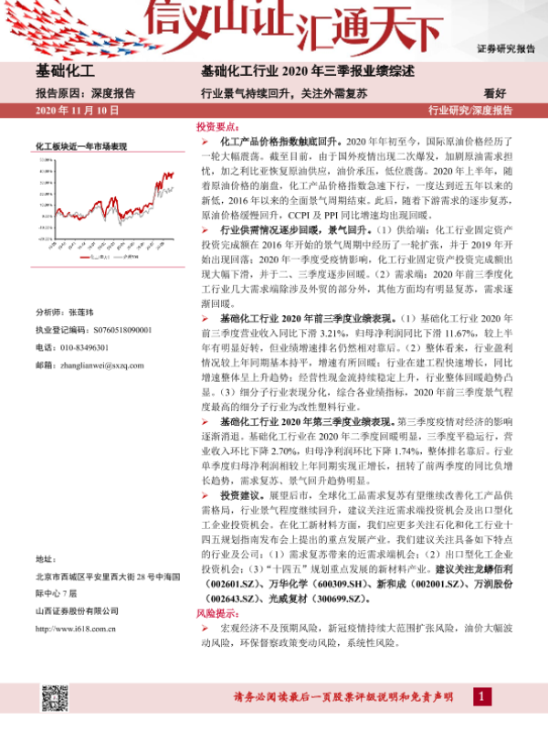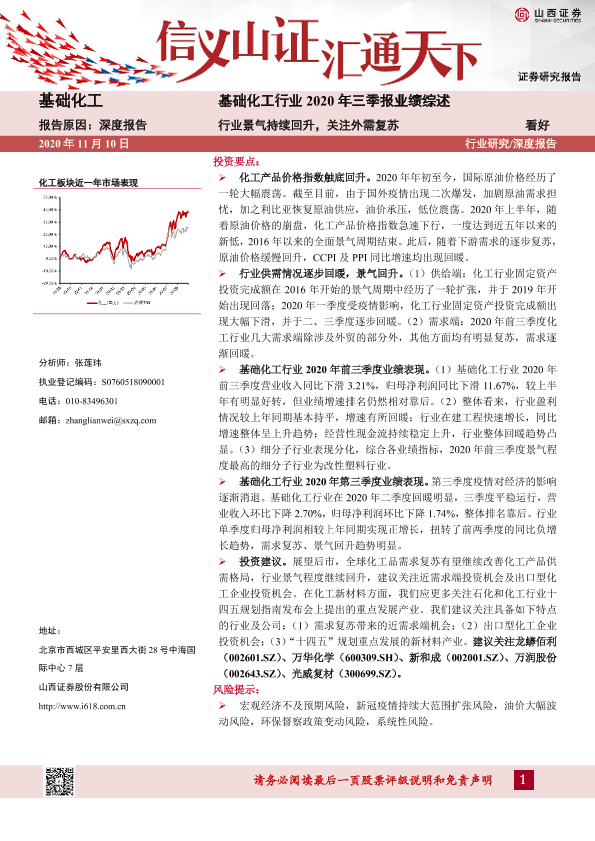 【山西证券】【20201110】基础化工行业2020年三季报业绩综述:行业景气持续回升,关注外需复苏-28页