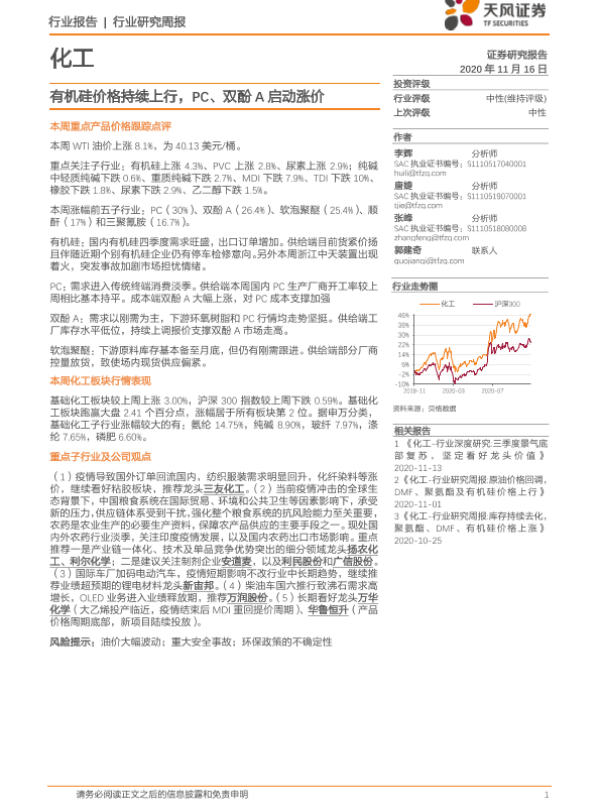 【天风证券】【20201116】20201116-天风证券-化工行业研究周报:有机硅价格持续上行,PC、双酚A启动涨价-22页