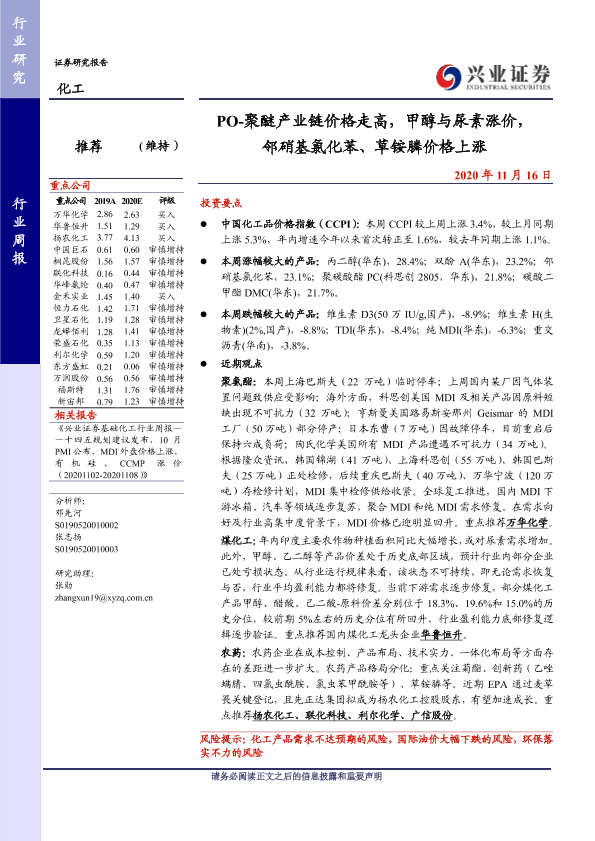 【兴业证券】【20201116】PO-聚醚产业链价格走高,甲醇与尿素涨价,邻硝基氯化苯、草铵膦价格上涨-39页