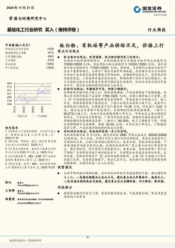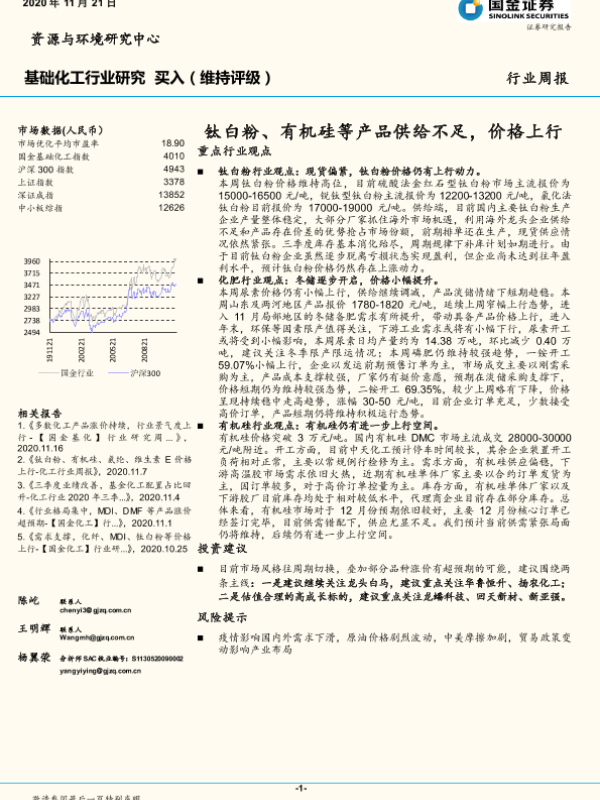 【国金证券】【20201121】基础化工行业研究:钛白粉、有机硅等产品供给不足,价格上行-15页