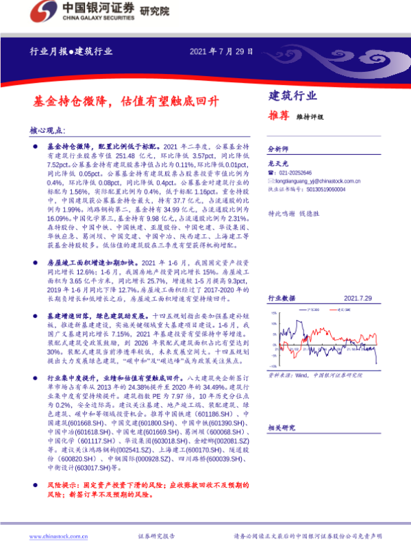 【银河证券】【20210729】建筑行业月报:基金持仓微降,估值有望触底回升-18页
