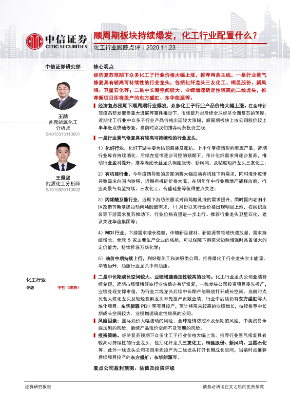 化工行业 投资策略 经济复苏 顺周期板块 龙头企业