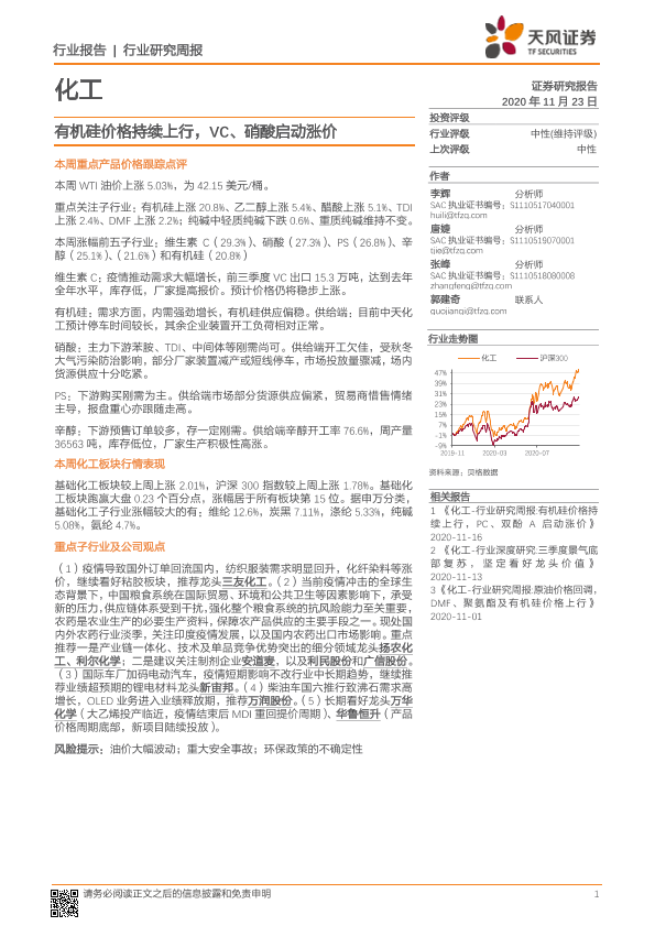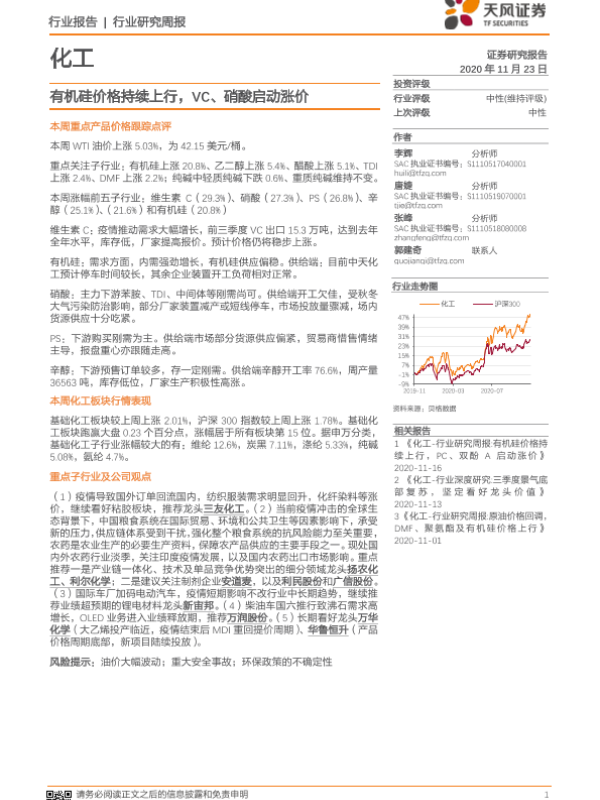 【天风证券】【20201123】20201123-天风证券-化工行业研究周报:有机硅价格持续上行,VC、硝酸启动涨价-21页
