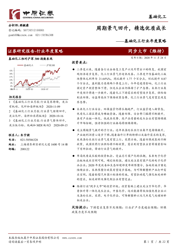 【中原证券】【20201124】基础化工行业年度策略:周期景气回升,精选优质成长-22页