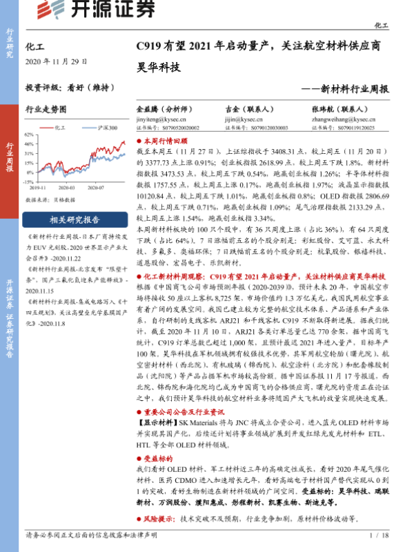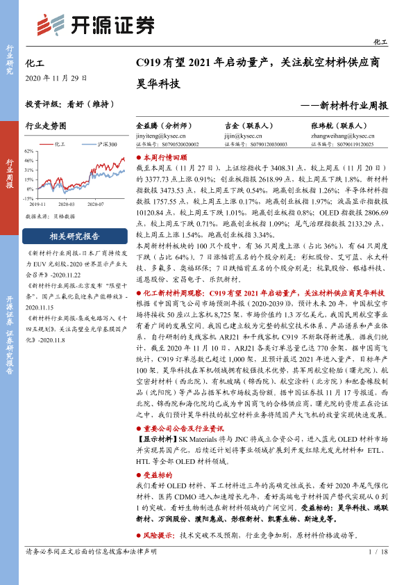 【开源证券】【20201129】新材料行业周报:C919有望2021年启动量产,关注航空材料供应商昊华科技-18页