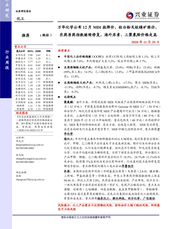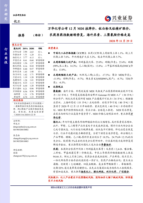 【兴业证券】【20201129】20201129-兴业证券-化工行业周报:万华化学公布12月MDI挂牌价,钛白粉及钛精矿涨价,农药原药指数继续修复,海外尿素、三聚氰胺价格走高-39页
