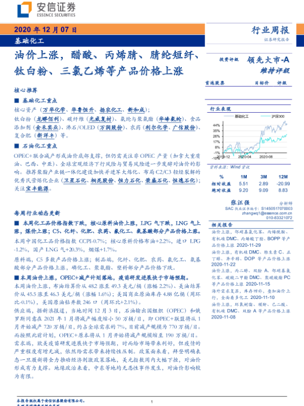 【安信证券】【20201207】基础化工行业周报:油价上涨,醋酸、丙烯腈、腈纶短纤、钛白粉、三氯乙烯等产品价格上涨-4页