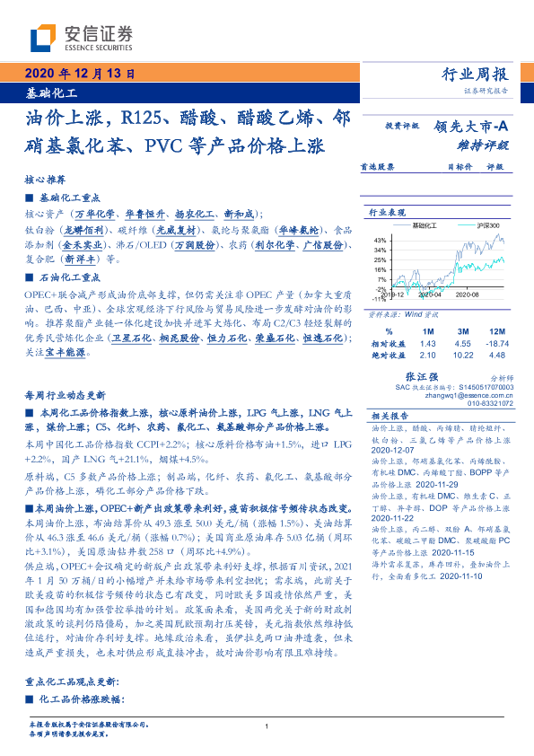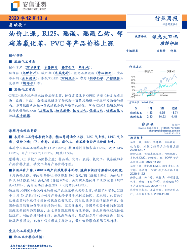 【安信证券】【20201213】基础化工行业周报:油价上涨,R125、醋酸、醋酸乙烯、邻硝基氯化苯、PVC等产品价格上涨-4页