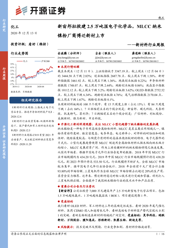 【开源证券】【20201213】新材料行业周报:新宙邦拟投建2.5万吨湿电子化学品,MLCC纳米镍粉厂商博迁新材上市-16页