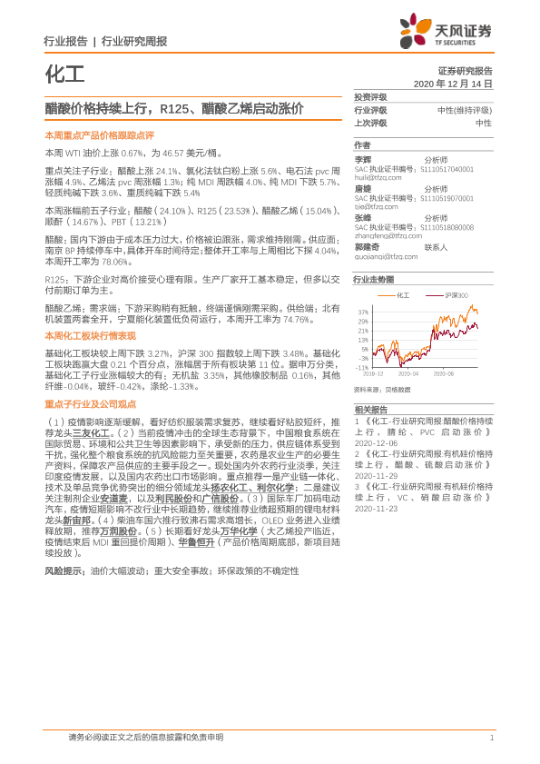 【天风证券】【20201214】20201214-天风证券-化工行业研究周报:醋酸价格持续上行,R125、醋酸乙烯启动涨价-22页