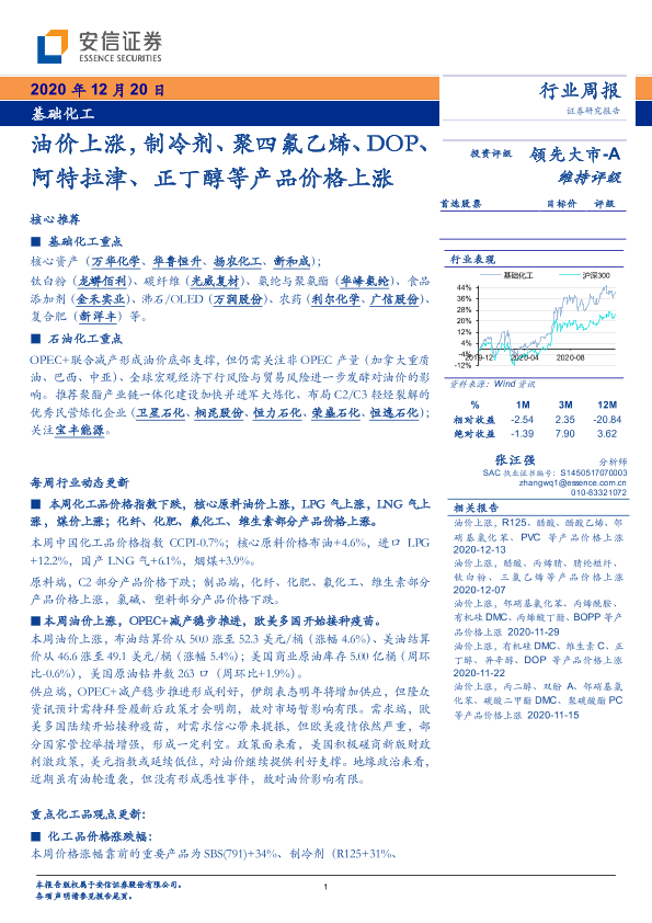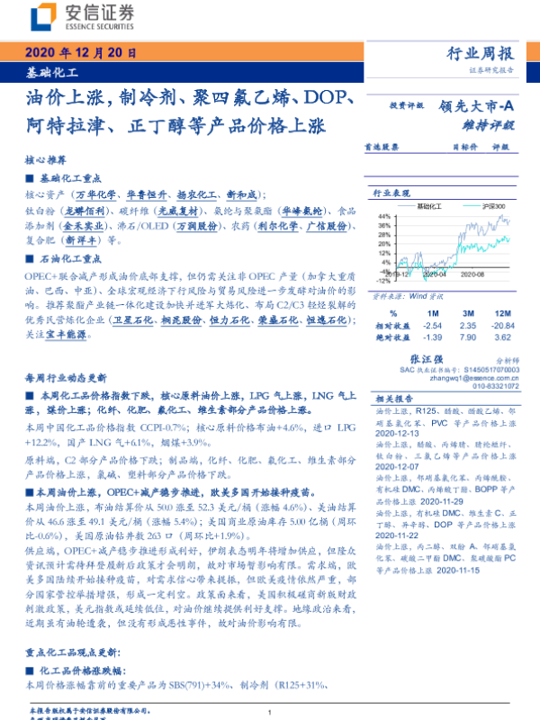 【安信证券】【20201220】基础化工行业周报:油价上涨,制冷剂、聚四氟乙烯、DOP、阿特拉津、正丁醇等产品价格上涨-4页