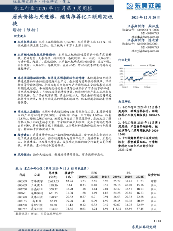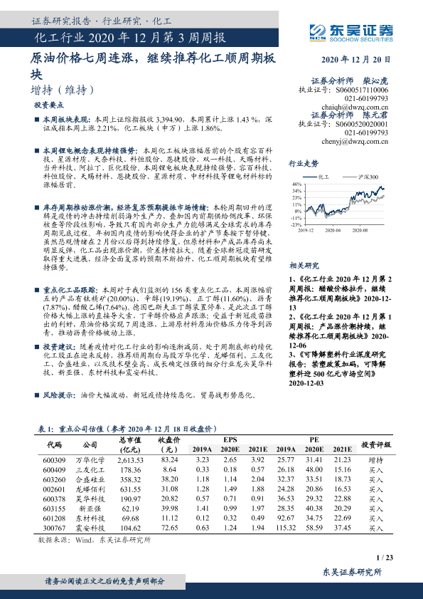 【东吴证券】【20201220】化工行业2020年12月第3周周报:原油价格七周连涨,继续推荐化工顺周期板块-23页